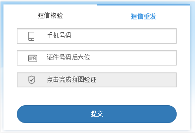 3.3 依次填寫驗(yàn)證信息(驗(yàn)證碼、手機(jī)號(hào)碼、證件號(hào)碼后六位)并完成圖形驗(yàn)證,點(diǎn)擊【提交】按鈕。
