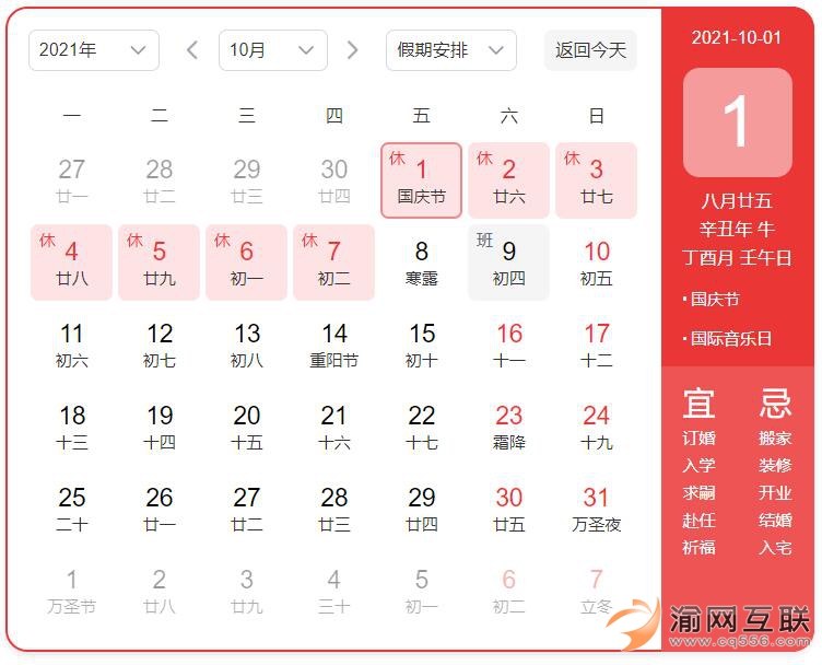 2021年國慶假期從10月1日起至7日,放假調(diào)休共7天,9月26日(星期日)和10月9日(星期六)上班。
