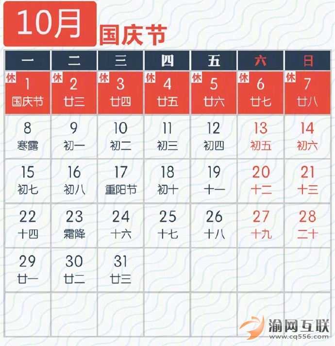 10月1日(星期一)、10月2日(星期二)、10月3日(星期三)為國(guó)慶節(jié)法定節(jié)假日。