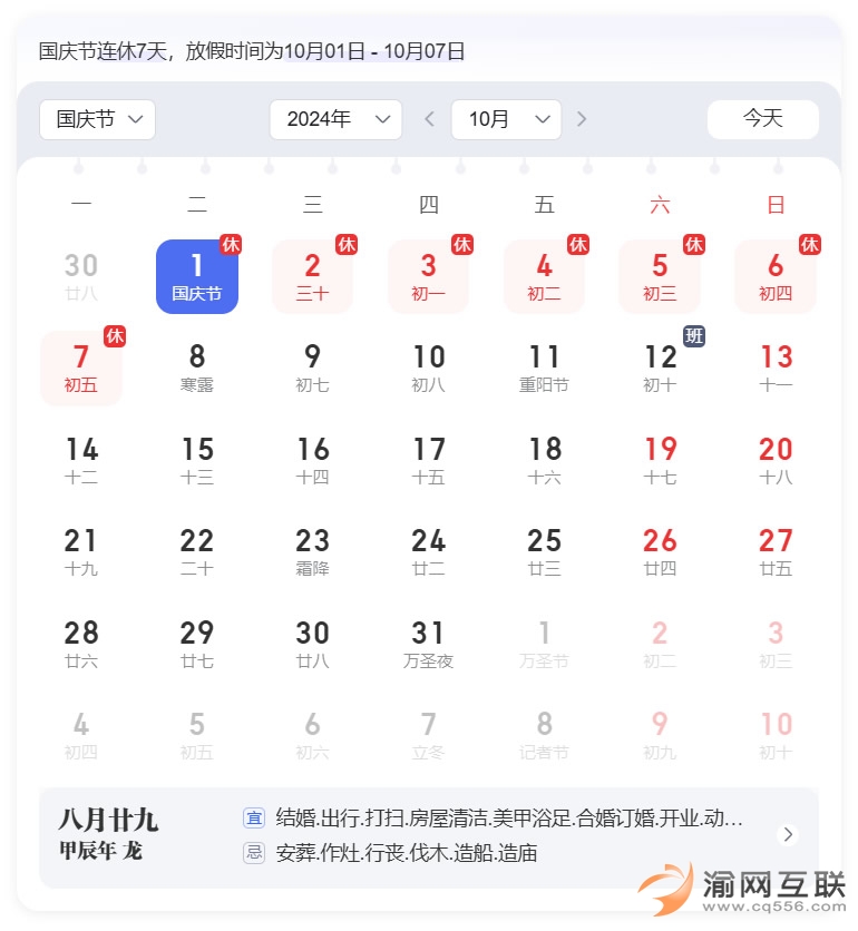 根據(jù)《國務(wù)院辦公廳關(guān)于2024年部分節(jié)假日安排的通知》,10月1日至10月7日,國慶節(jié)放假調(diào)休共7天,9月29日(星期日)和10月12日(星期六)上班 。