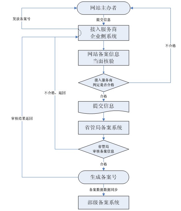 網(wǎng)站主辦者委托接入服務(wù)商代為報(bào)備網(wǎng)站的全部備案信息并核實(shí)信息真?zhèn)巍?gt;接入服務(wù)商核實(shí)備案信息——>將備案信息提交到省管局系統(tǒng)。