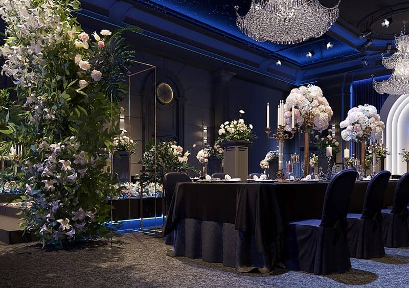 會(huì)場大廳的裝修設(shè)計(jì)會(huì)帶給賓客強(qiáng)烈的氛圍感受,過高的天頂適合那些人數(shù)較多,場面較大的婚禮。較低的天頂只適合那些人數(shù)較少、溫馨的小型婚禮。